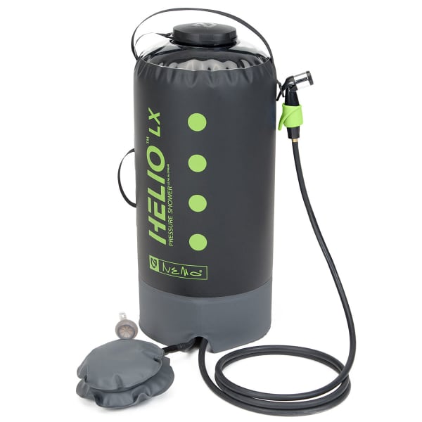 Contrairement aux douches de camp par gravité qui doivent être suspendues au-dessus de la tête et produisent une pression d'eau lamentable, la HELIO LX de Nemo Equipment est une douche solaire de voyage qui repose solidement sur le sol et fournit la pression nécessaire à une bonne douche.