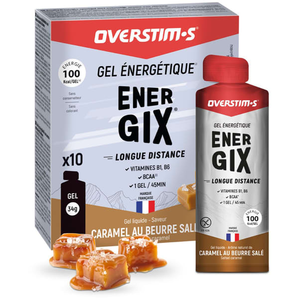 Le gel ENERGIX LIQUIDE CARAMEL BEURRE SALE PACK X10 de Overstims est un produit énergétique à consommer durant les efforts sportifs longs afin de gagner en endurance. Il délivre progressivement l’énergie contenue et nourrit votre organisme avec ses BCAA ainsi que les vitamines B6 et B1 dans le but de limiter l’apparition de la fatigue musculaire. Un seul gel contient 26 g de glucides, soit 100 kcal. Il est recommandé de le consommer à intervalles réguliers de 45 minutes pendant votre effort. Sa texture liquide est agréable et il est facilement assimilable durant votre effort grâce à sa composition sans colorants ni conservateurs qui évite les désagréments intestinaux.